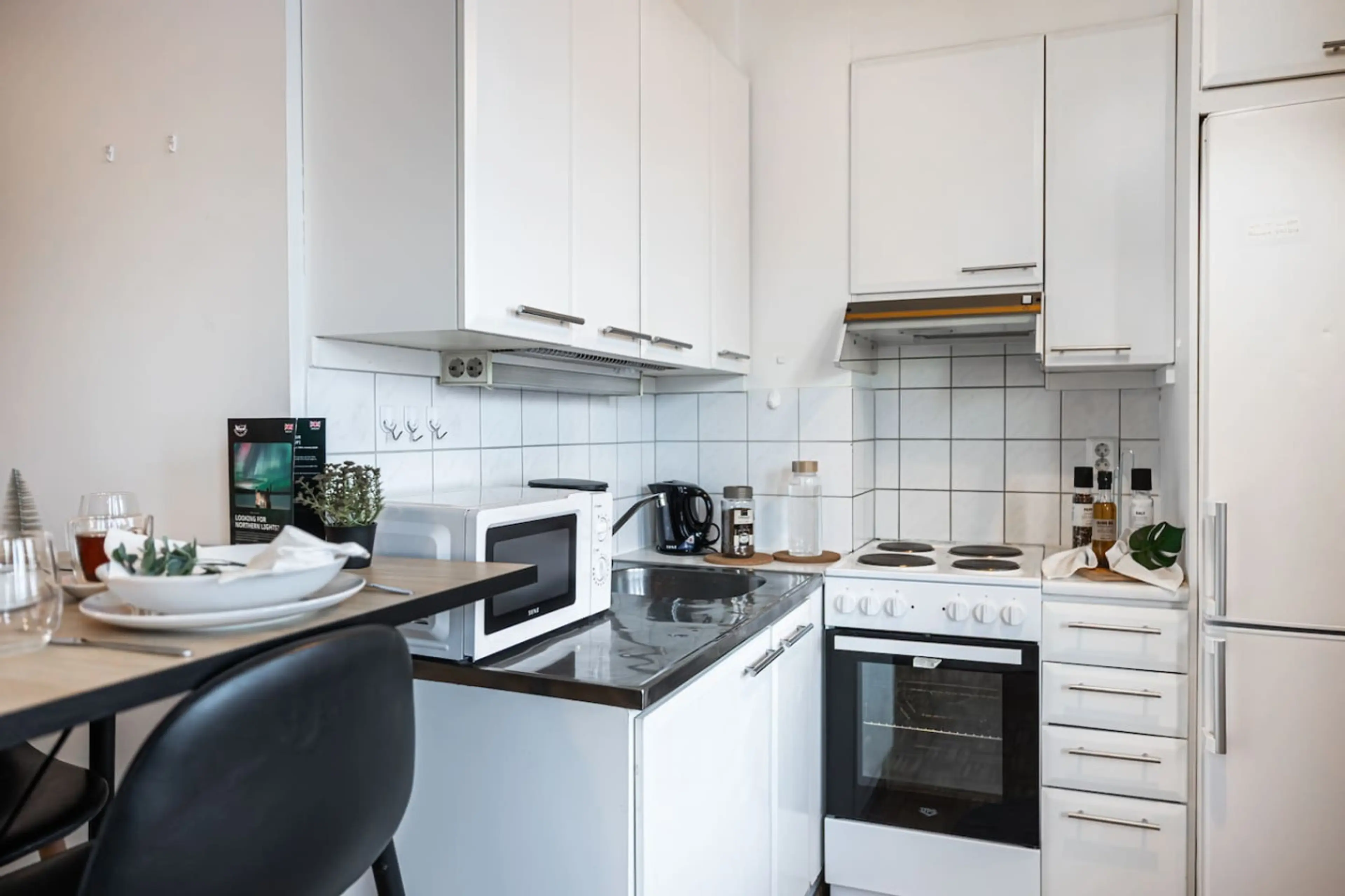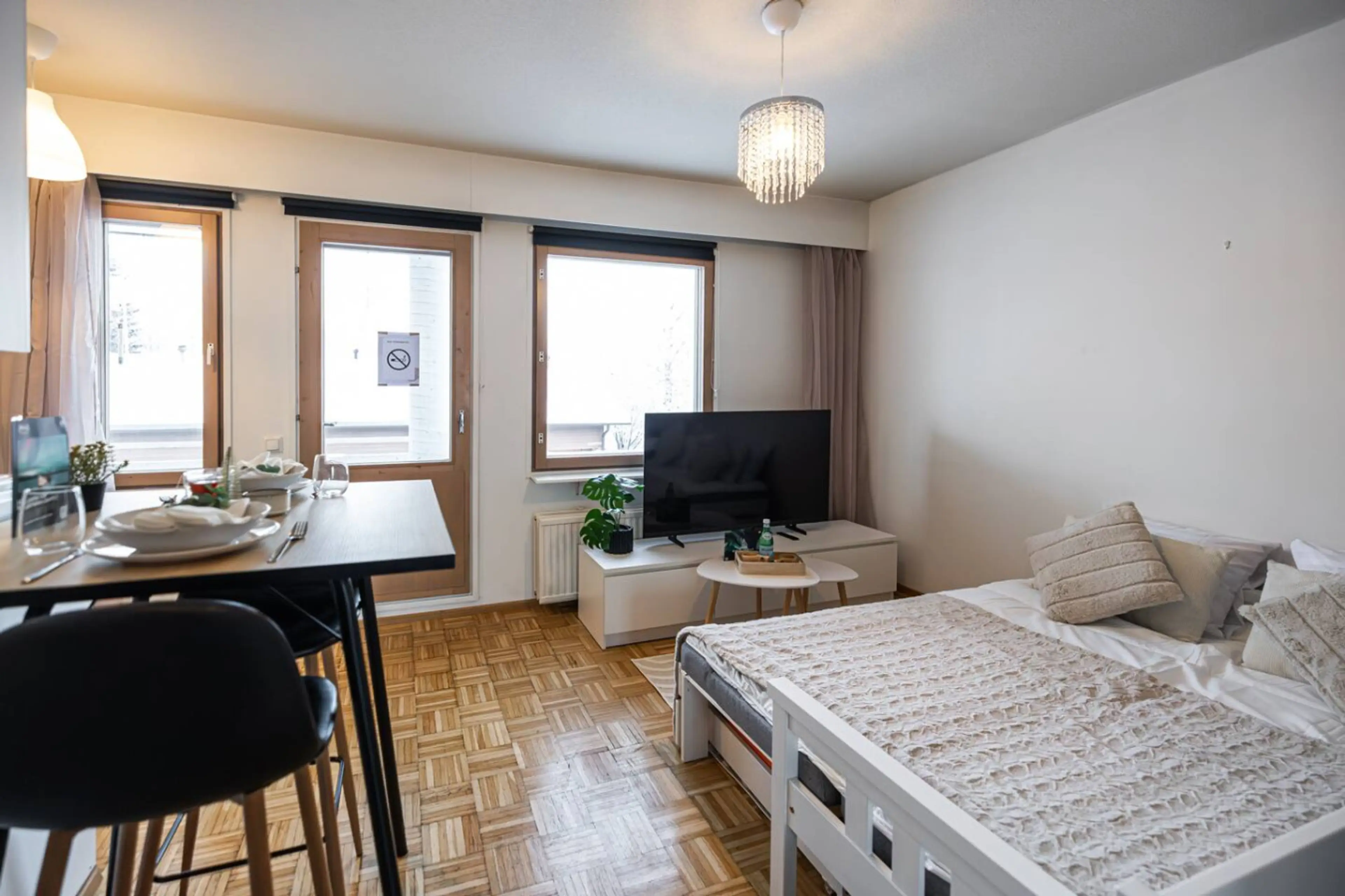 A bright and welcoming 30 m² studio featuring a 140 cm bed, comfy sofa bed, private sauna, balcony with winter views, and a compact well-equipped kitchen. Stylish Nordic décor, soft textures, and warm lighting create an inviting atmosphere. Includes parking and easy self check-in with a lockbox. Per...